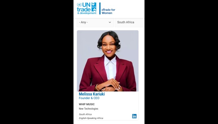 Whip Music, a Johannesburg-based music-tech company founded by Melissa Kariuki, has been selected to join the United Nations Conference on Trade and Development (UNCTAD) initiative, eTrade for Women, becoming one of only a handful of African companies recognised for advancing inclusive digital trade.